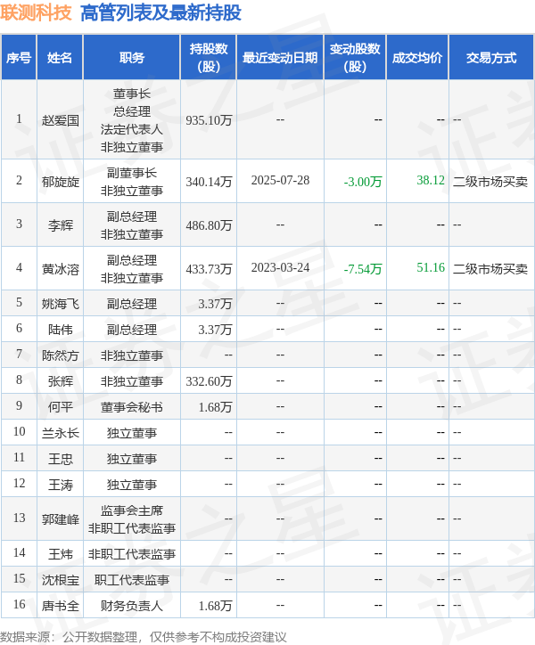 联测科技近半年内的董监高及核心技术人员增减持详情如下: